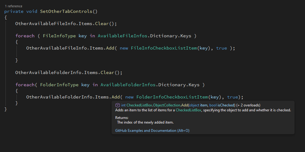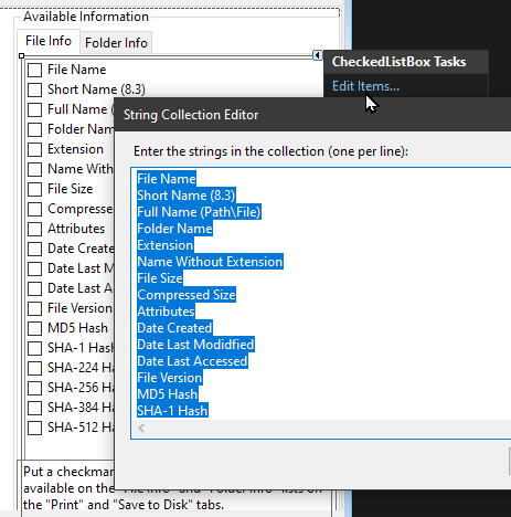 The next step is populating the File Info and Folder Info CheckedListBoxes on the Print and Save to Disk tabs based on which members are checked ✅as available in the configuration.
