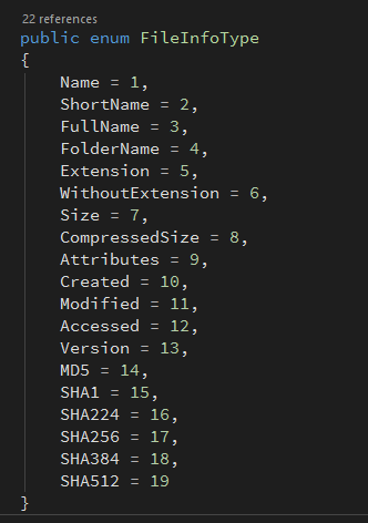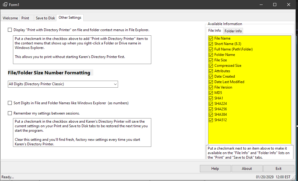 I’ve been wiring up the user interface of Karen’s Directory Printer 26. This morning I created enums and classes to support the programmatic population of those CheckedListBox controls under File Info and Folder Info on the Other Settings tab. The enums associate each data type with a number. The classes associate the enums with English. The English can be easily swapped out for other languages.